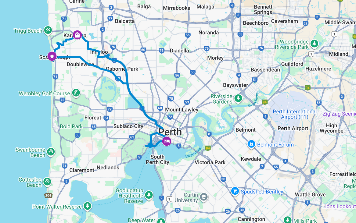 Perth liegt ca. 20km von der Küste entfernt. Im Bereich von Perth gibt es eine Vielzahl von Stränden. Wir wählten den Scarborough Beach aus und besuchten anschliessend das Einkaufszentrum Karrinyup, um unsere Vorräte weiter aufzustocken.