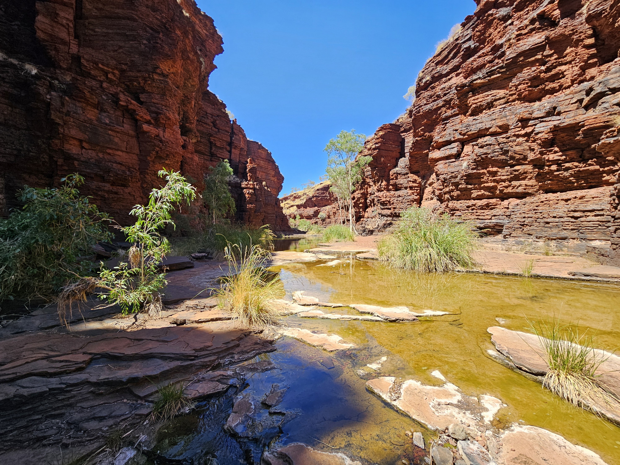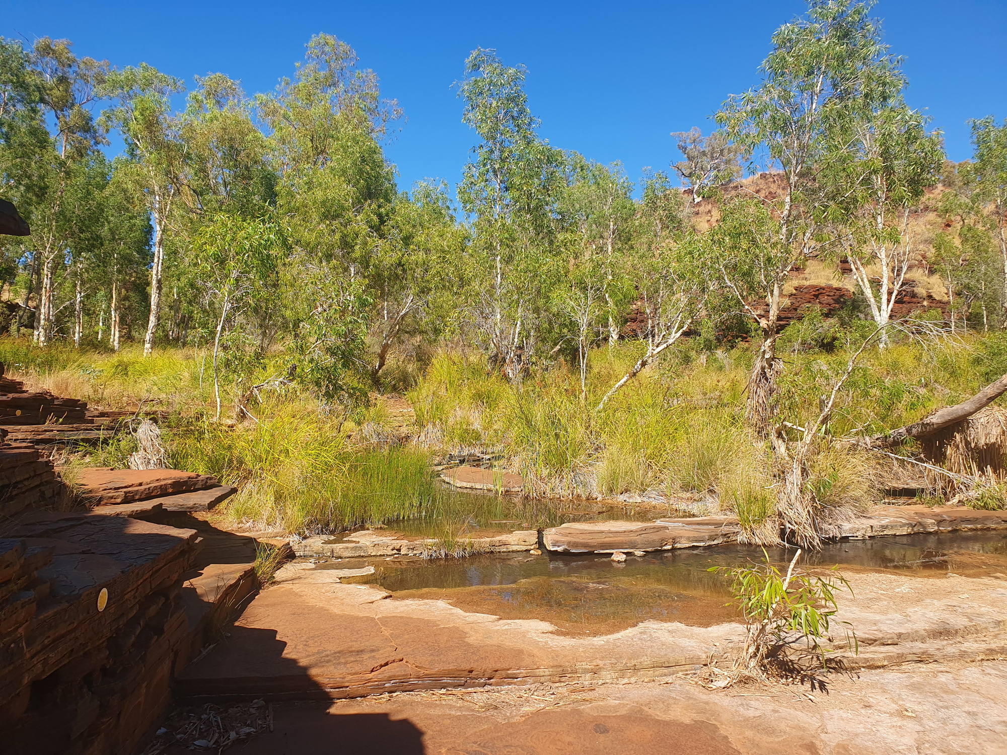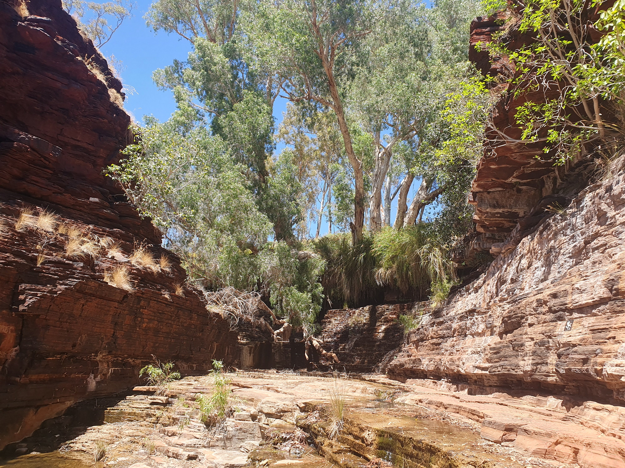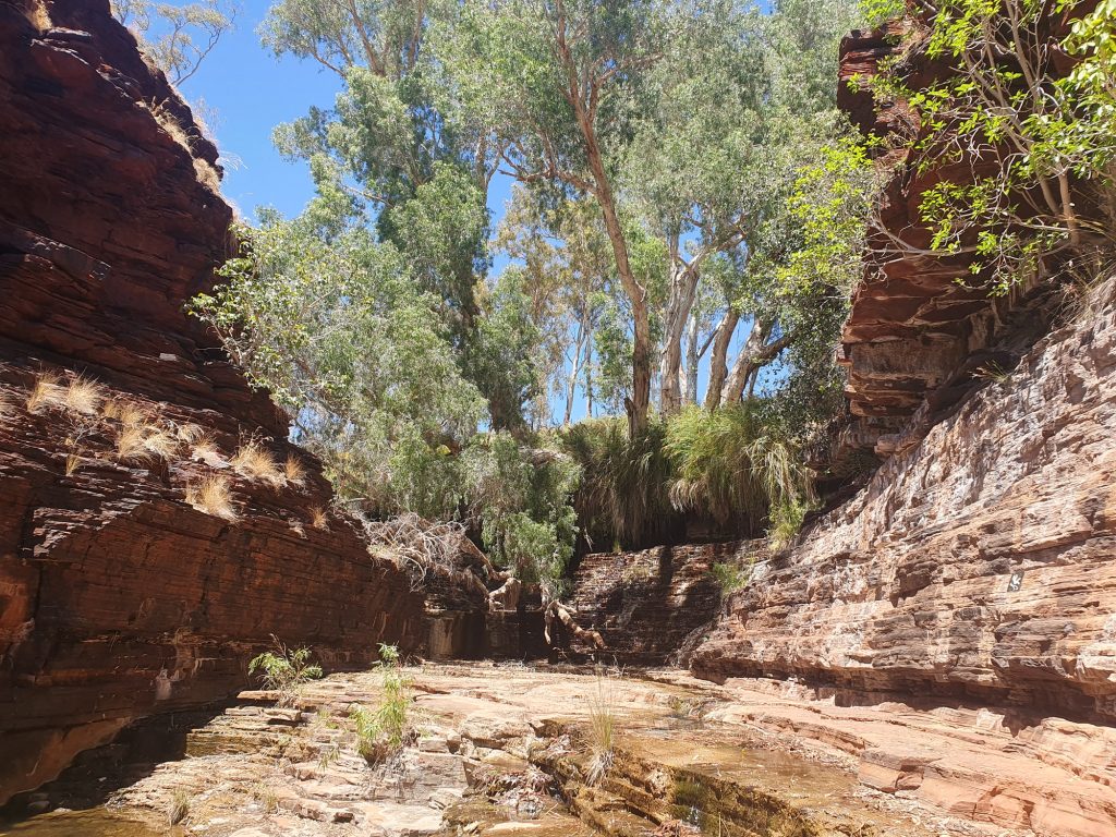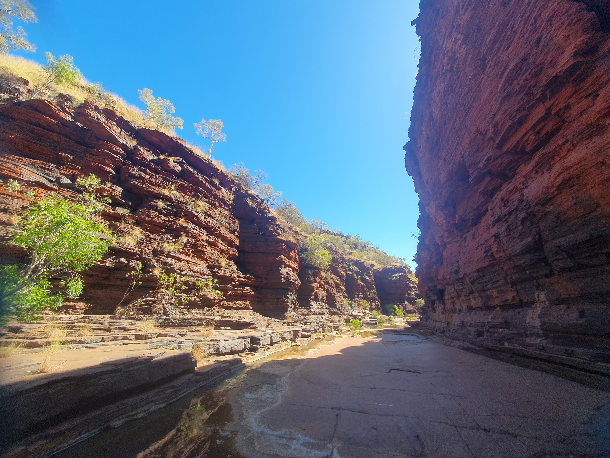 Die Wanderung im Kalamina Gorge war unser Highlight. Das Wasserplätschern und die fantastischen Farben mit dem Felsen auf beiden Seiten machen den Besuch zu einem echten Erlebnis. Man geht meistens auf Steinplatten, die auch mal lose sein können. Wir empfehlen gutes Schuhwerk. Wir starteten auch diese Wanderung um 0840 früh. So hatten wir noch einige Abschnitte im Schatten. Auf dem Rückweg war der Anteil Schatten bereits deutlich kleiner. Die Wanderung geht über ca. 3km und wir brauchten mit vielen Fotostops und einem Erfrischungsbad am Ende im Arch Pool gute 2h.
