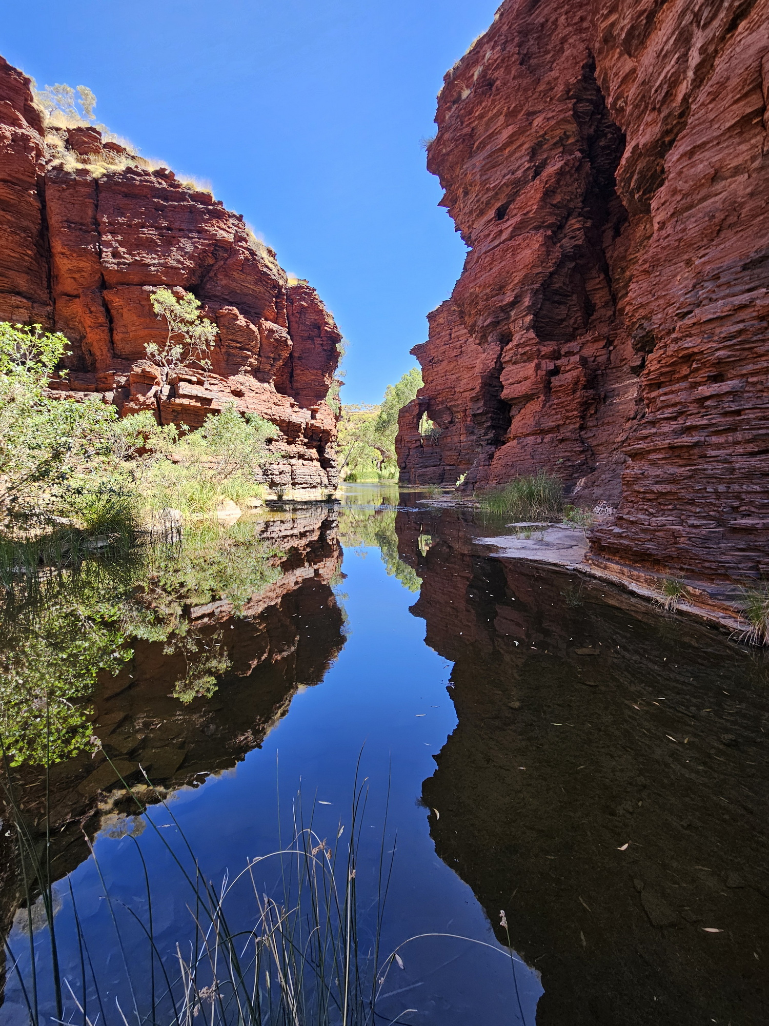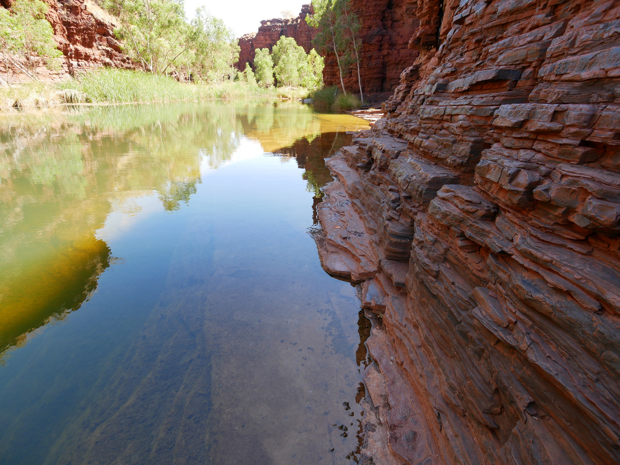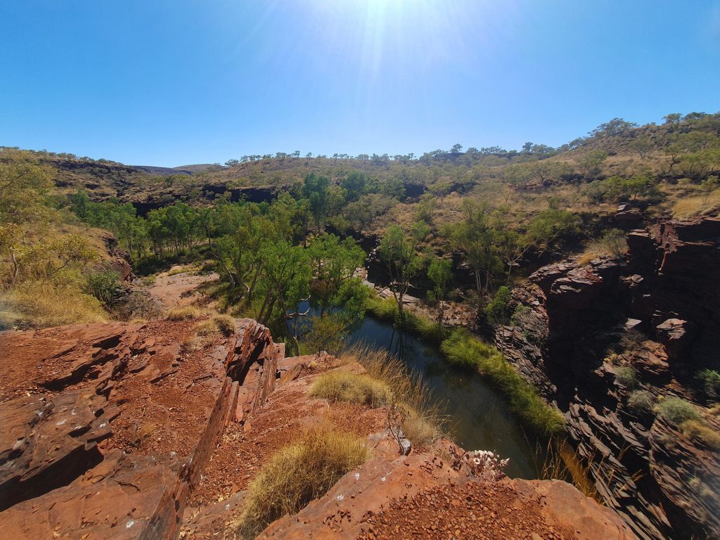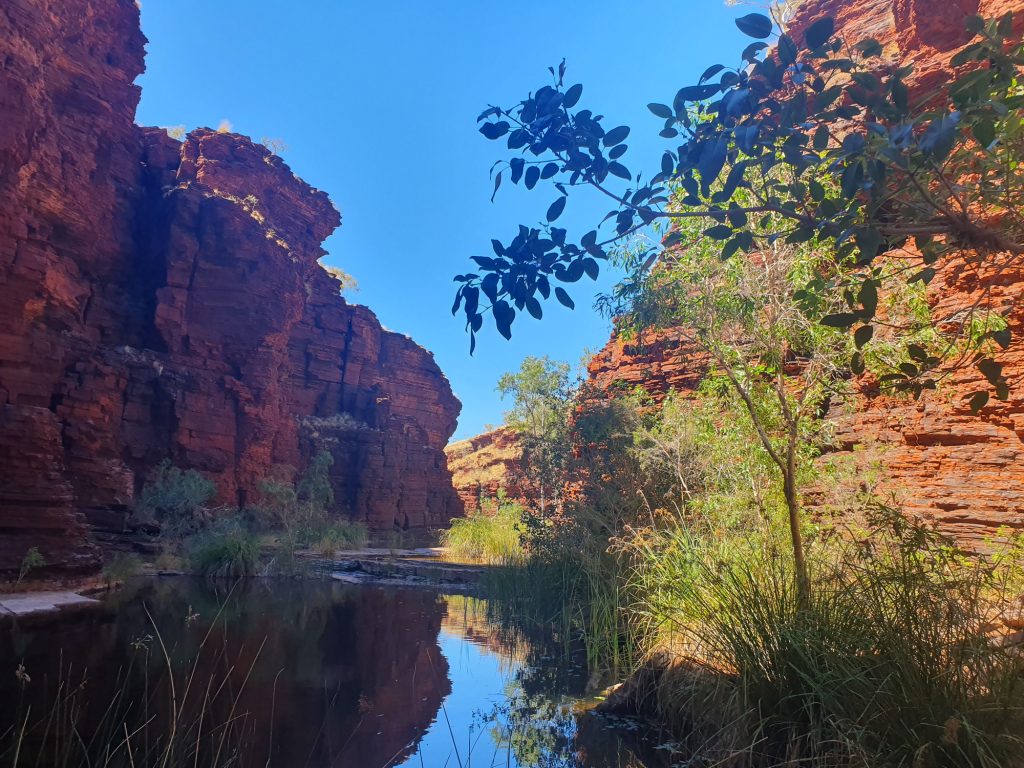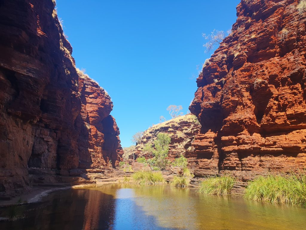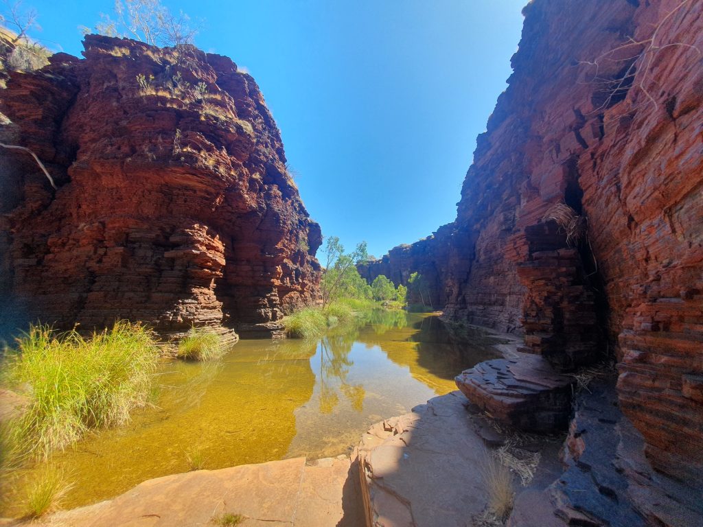 Die Wanderung im Kalamina Gorge war unser Highlight. Das Wasserplätschern und die fantastischen Farben mit dem Felsen auf beiden Seiten machen den Besuch zu einem echten Erlebnis. Man geht meistens auf Steinplatten, die auch mal lose sein können. Wir empfehlen gutes Schuhwerk. Wir starteten auch diese Wanderung um 0840 früh. So hatten wir noch einige Abschnitte im Schatten. Auf dem Rückweg war der Anteil Schatten bereits deutlich kleiner. Die Wanderung geht über ca. 3km und wir brauchten mit vielen Fotostops und einem Erfrischungsbad am Ende im Arch Pool gute 2h.