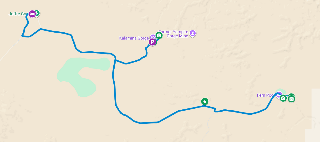 Der Kalamina Gorge kann nur über eine Schotterstrasse erreicht werden. Es ist dringend ein wirklicher 4×4 empfohlen, da die Strasse auf 6km Länge eine ziemliche Herausforderung war (Wellblechpiste, Steine, Löcher).