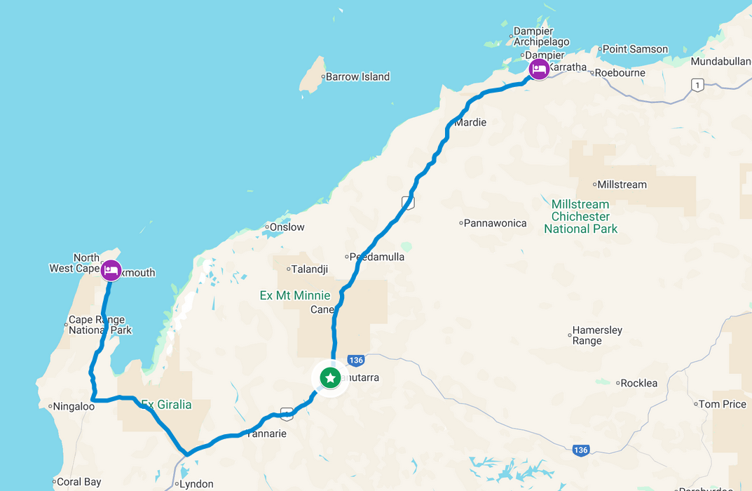 Die Fahrt brachte uns über 552km asphaltierte Strassen durch eine karge Landschaft von Karratha nach Exmouth in knapp 6h Fahrzeit.