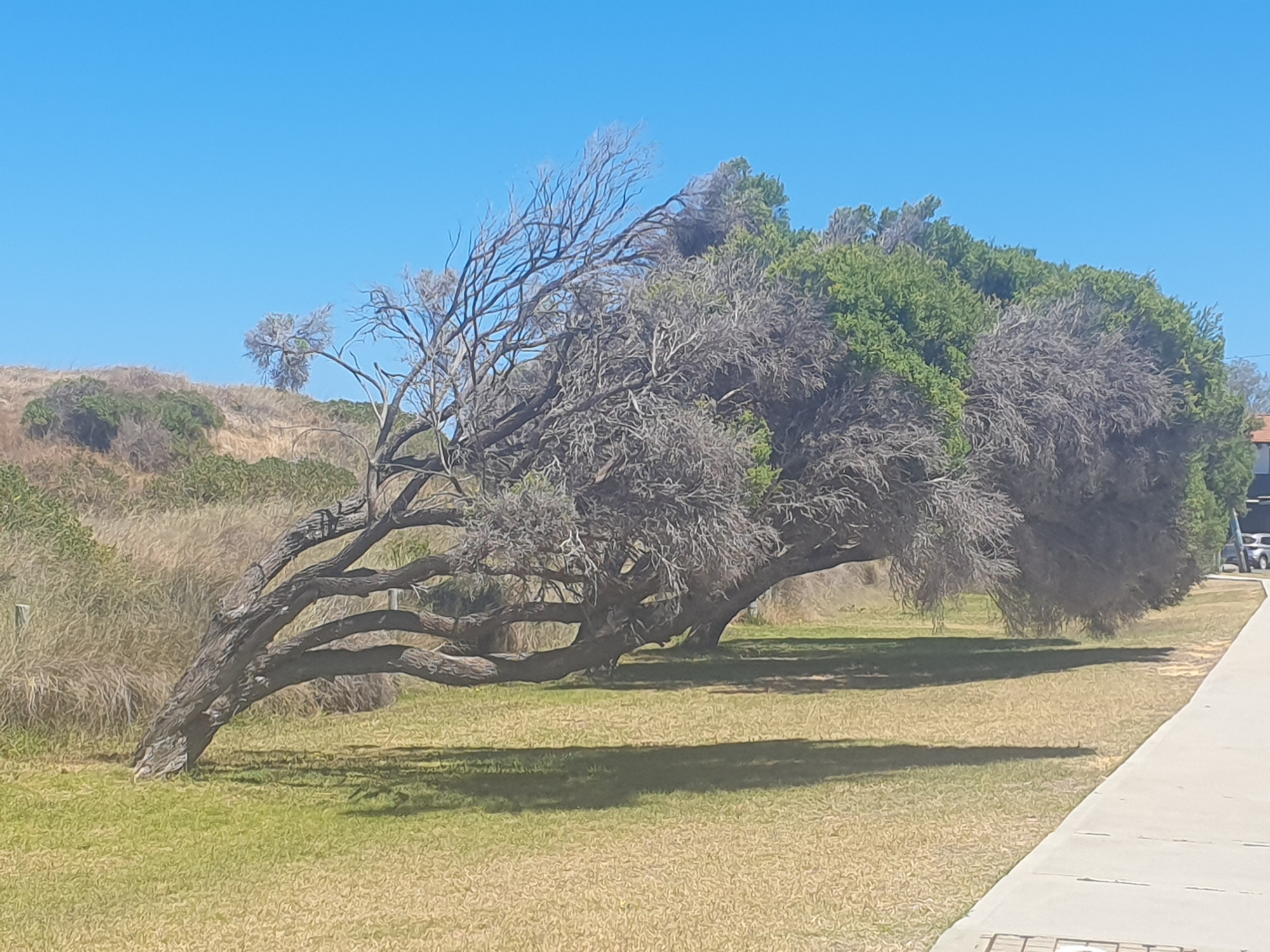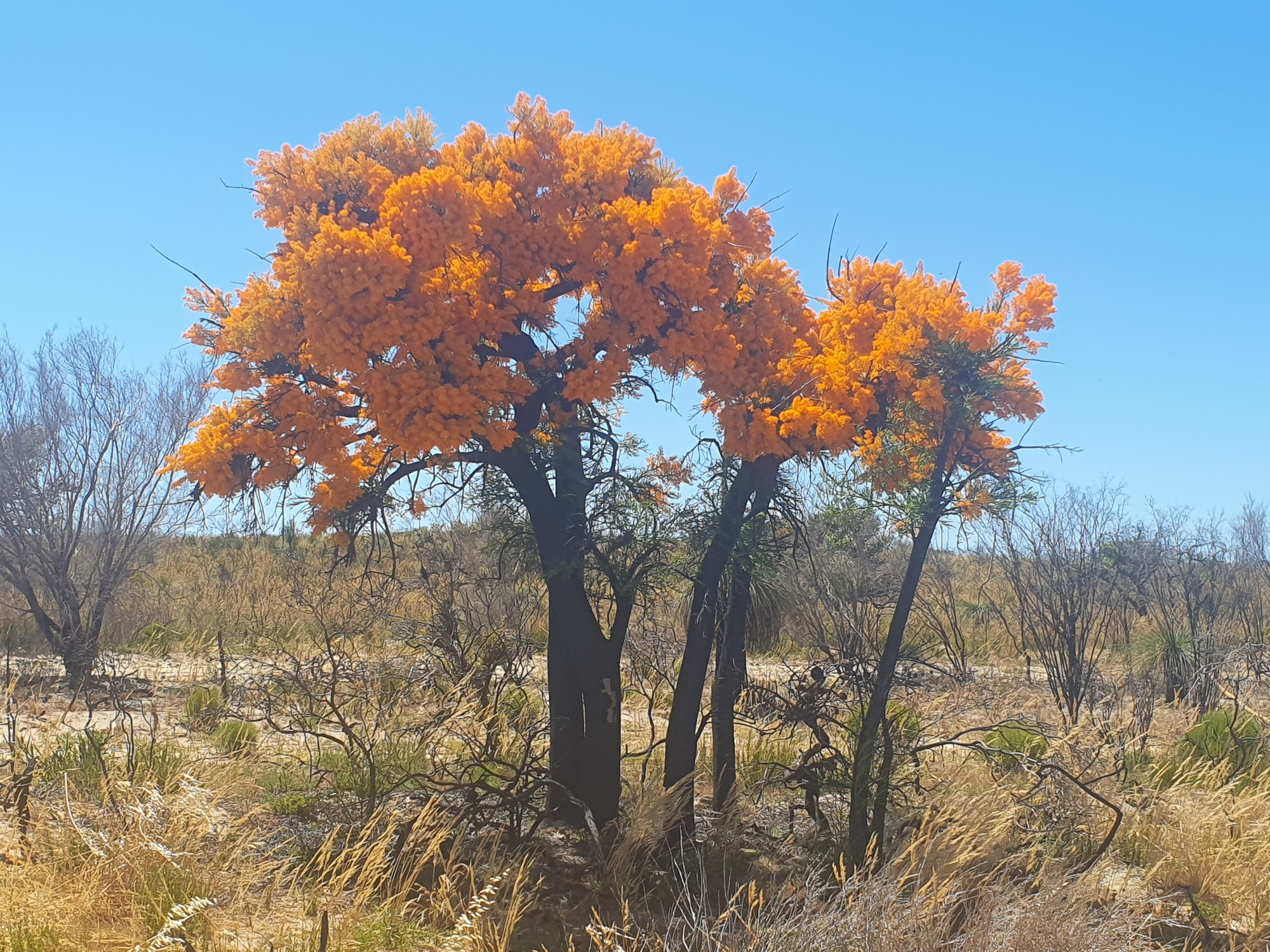 Unterwegs sahen wir immer wieder leuchtend orange Büsche. Sie werden auch West Australien Christmas Tree genannt. Genau genommen handelt es sich um einen Parasiten (ähnlich wie eine Mistel, der sich in anderen Pflanzen festmacht und seine Nährstoffe von dieser Pflanze bezieht.