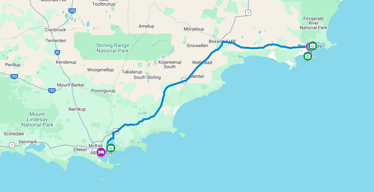 Die Fahrt ging von Bremer Bay nach Westen nach Albany (222km, Fahrzeit 3h30). Die Temperatur hatte sich merklich abgekühlt und wir hatten nur maximal 22°C – schon fast etwas frisch im Vergleich zu den vorigen Tagen.