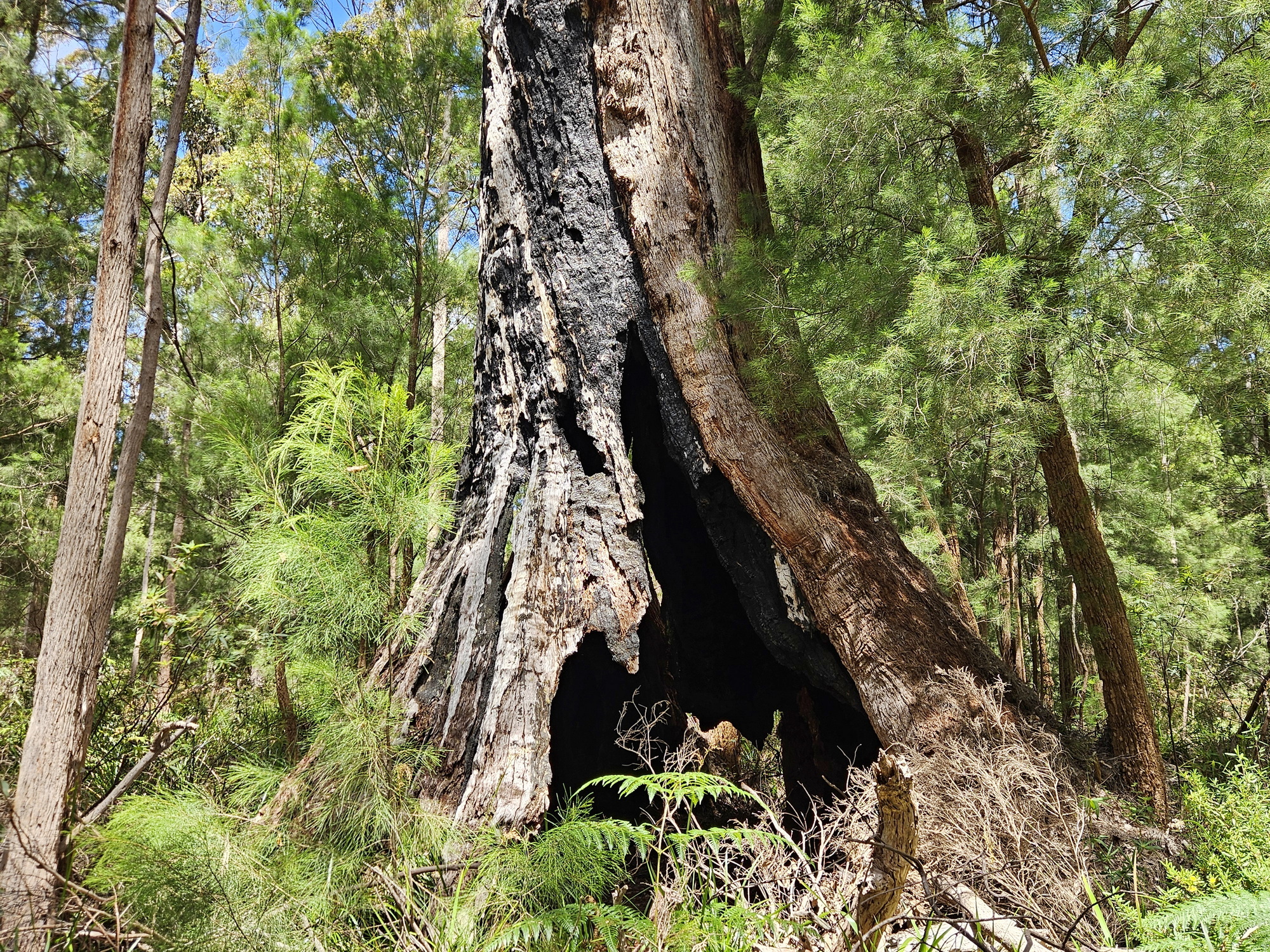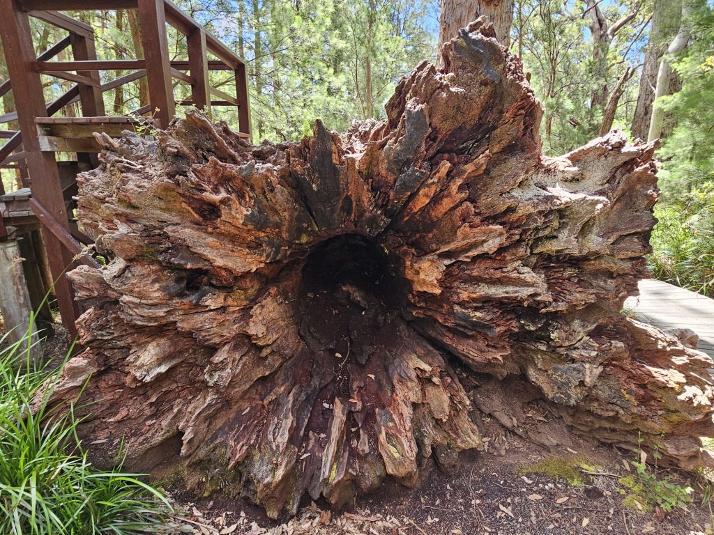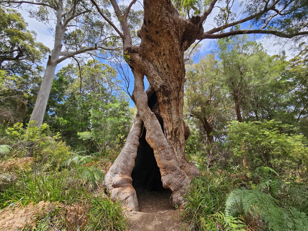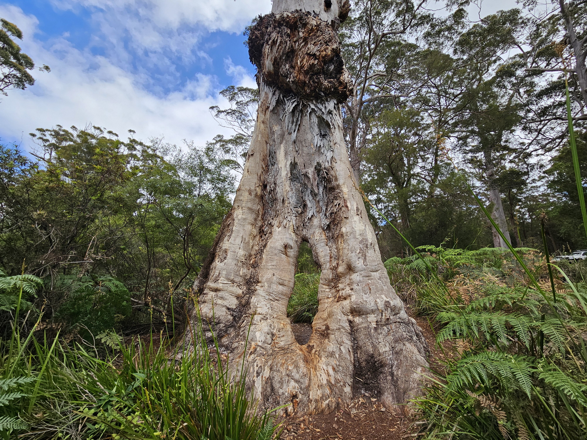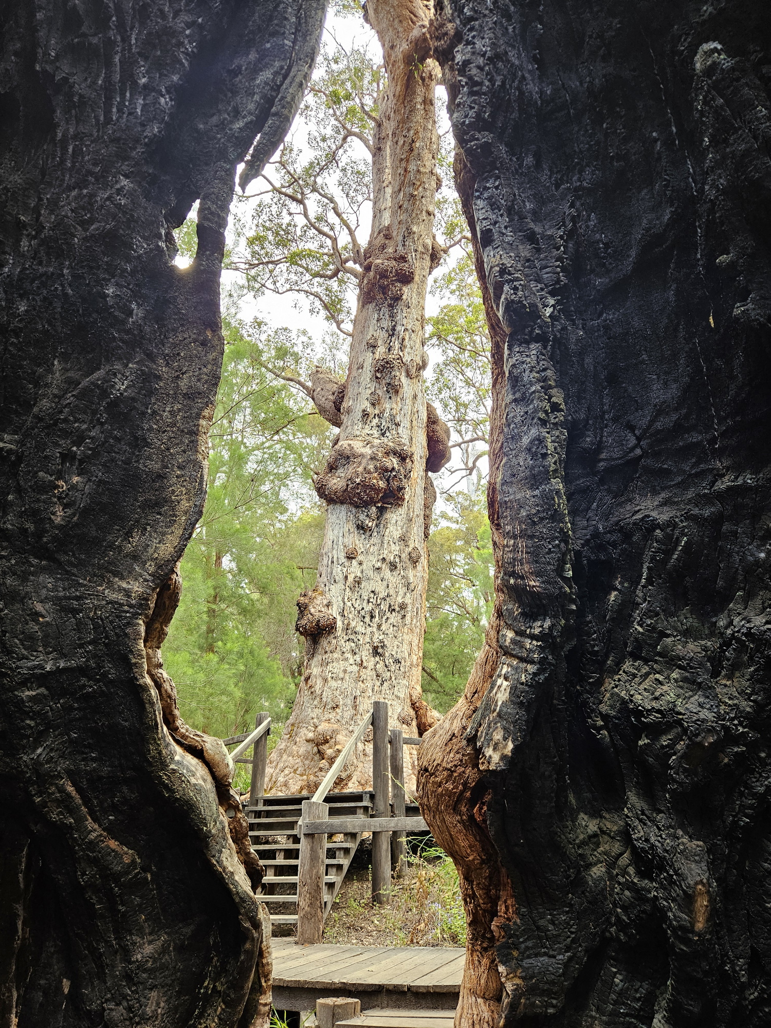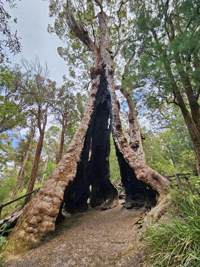 Der Giant Tingle Tree ist ca. 400 Jahre alt und hat unten Durchmesser unten von über 22m. Bei einem Waldbrand verbrennt zwar das tote Holz im Inneren des Baumes, aber es bleiben Schichten unter der Rinde, die die Säfte transportieren können. So überlegen diese Giganten auch Waldbrände.