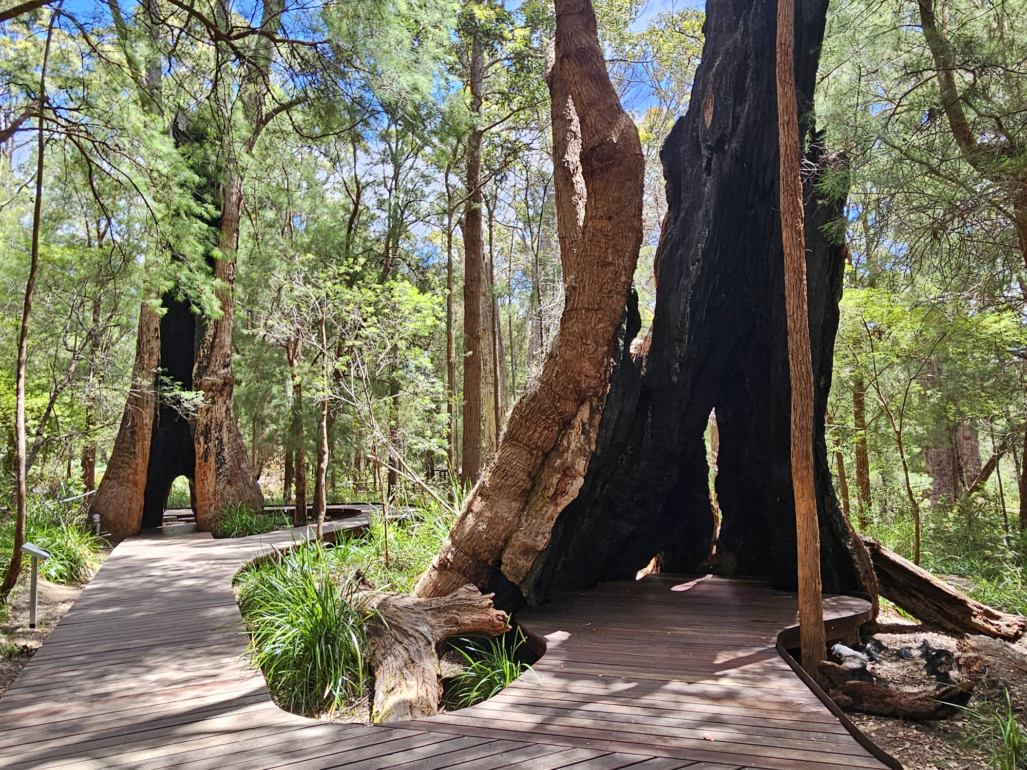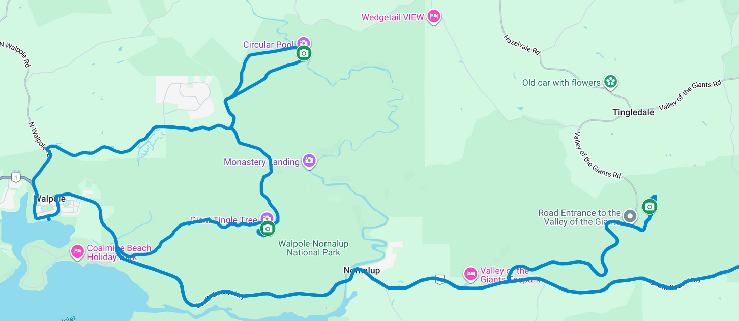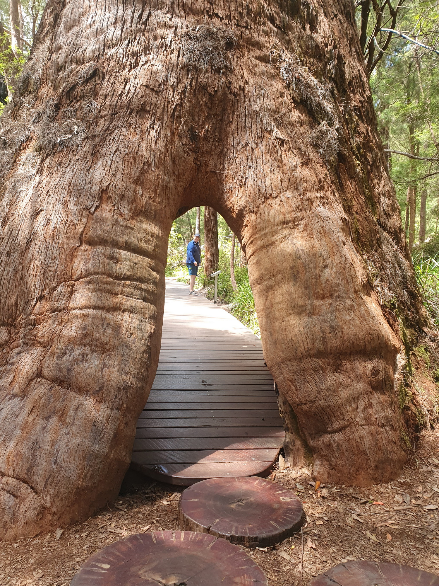Unser erstes Ziel war der Walpole-Nornalup-Nationalpark (Wikipedia). Hier wachsen riesige Karribäume und sog. „Red Tingles“ Bäume. Kurz vor Walpole bogen wir auf einen Waldweg ab, der uns zum Giant Tingle Tree führte. Dann fuhren wir weiter zum Circular Pool für unsere Mittagspause.
