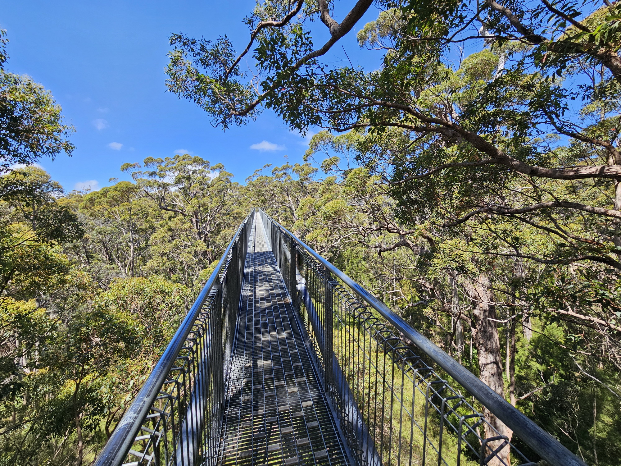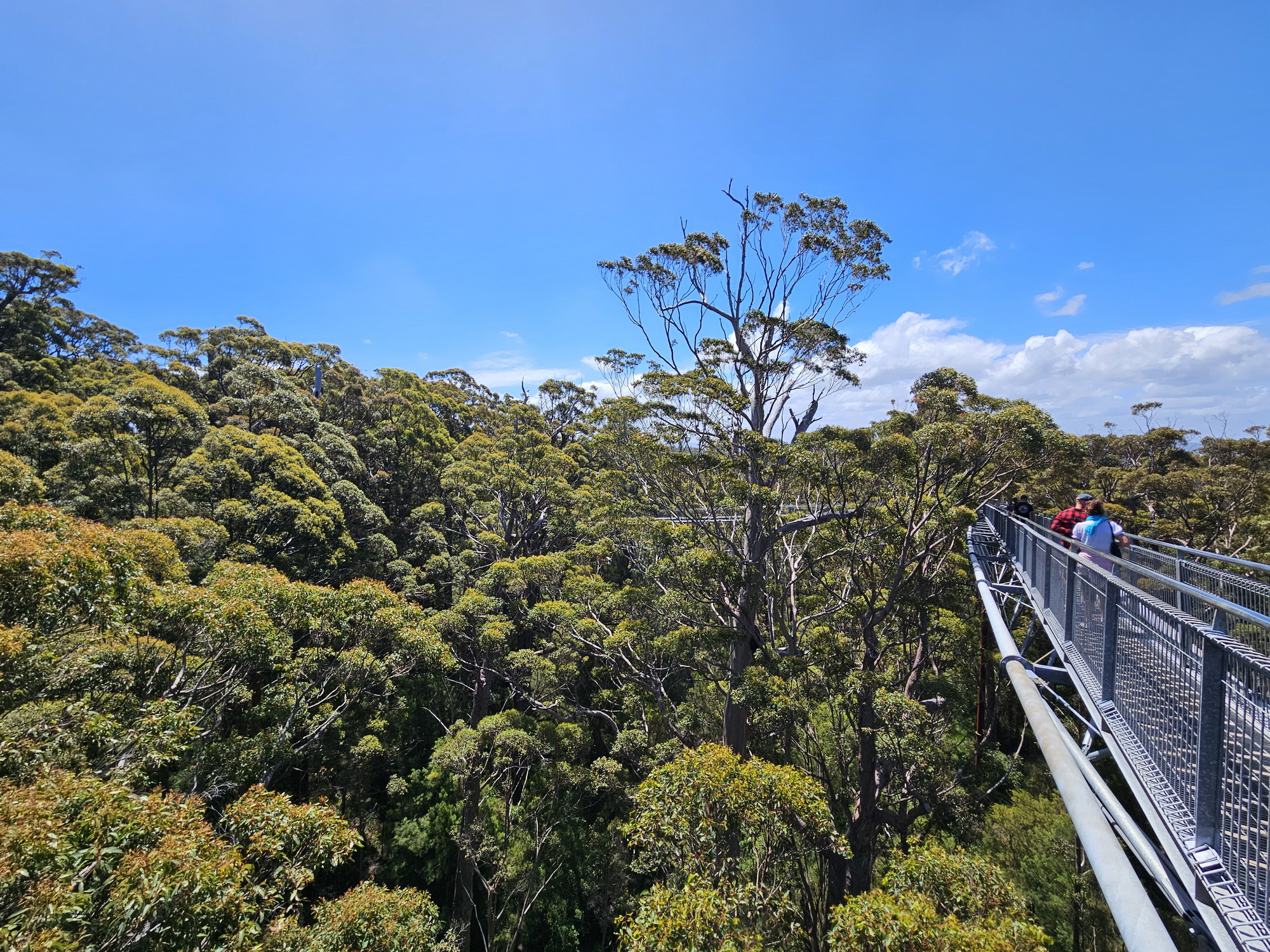 Etwas östlich von Walpol liegt der Valley of the Giants Tree Top Walk. Am Boden kann man einen sehr interessanten und gut dokumentierten Rundgang machen und viele grosse Bäume bewundern. Mit einem Eintritt kann man dann auf den sog. Top Walk gehen. Auf schmalen Gehwegen bewegt man sich bis 40m (!) über dem Waldboden und ist immer noch weiter unter den Baumkronen dieser Riesen, die bis 90m gross werden können. Die Konstruktion schwankt dabei ein wenig.