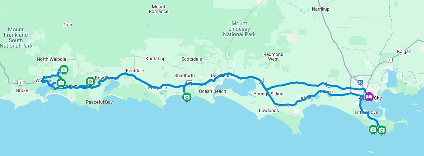 Unser Tagesausflug brachte uns von Albany nach Walpole und dann über mehrere Stationen zurück nach Albany (330km, Fahrzeit ca. 5h).