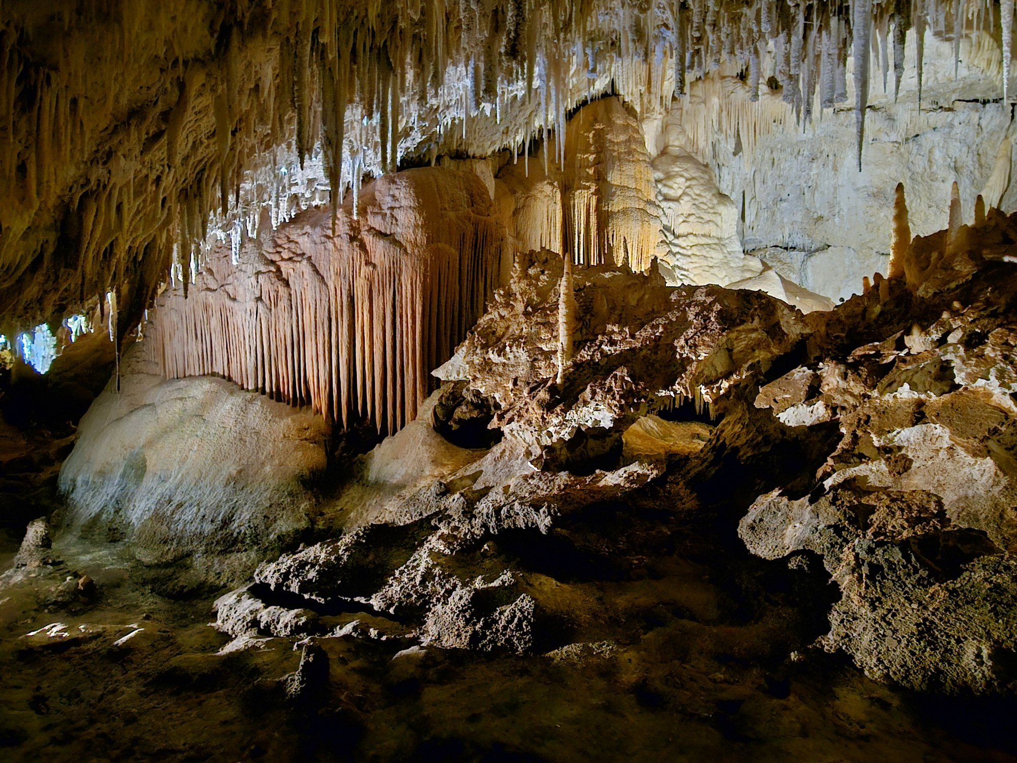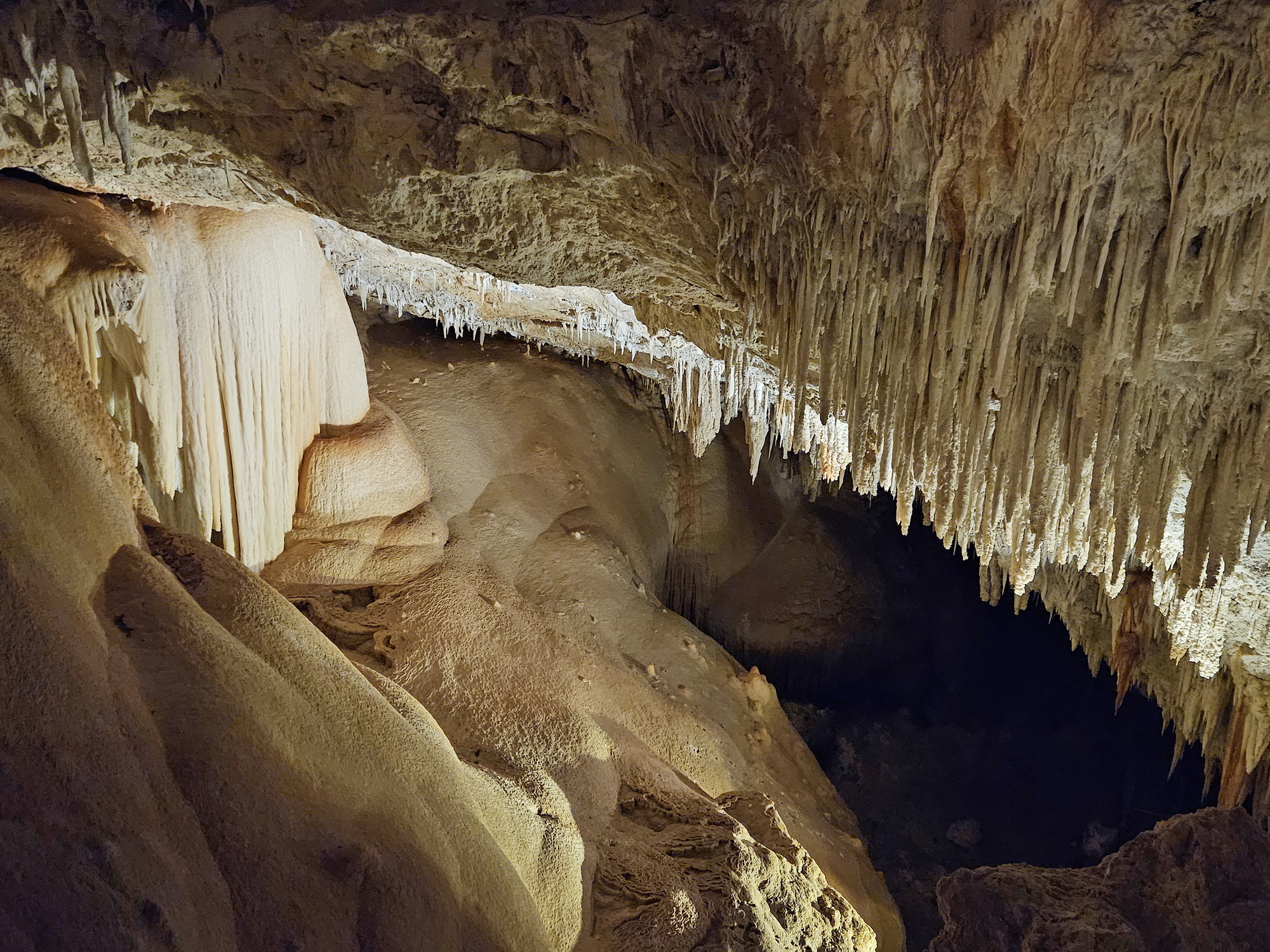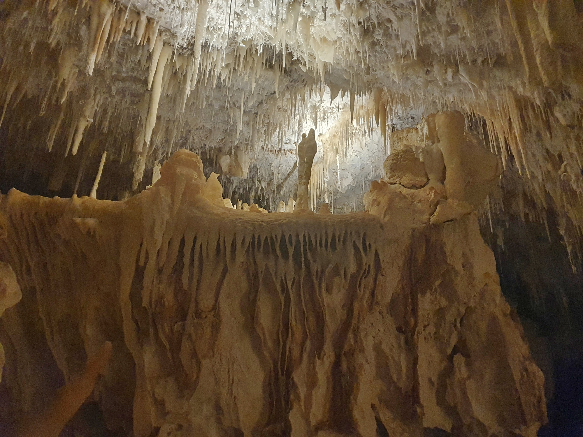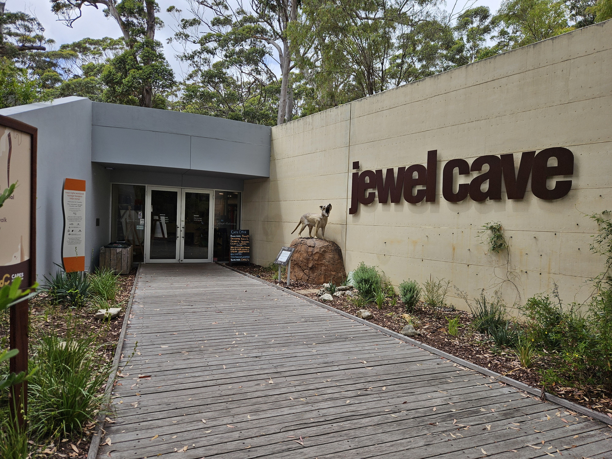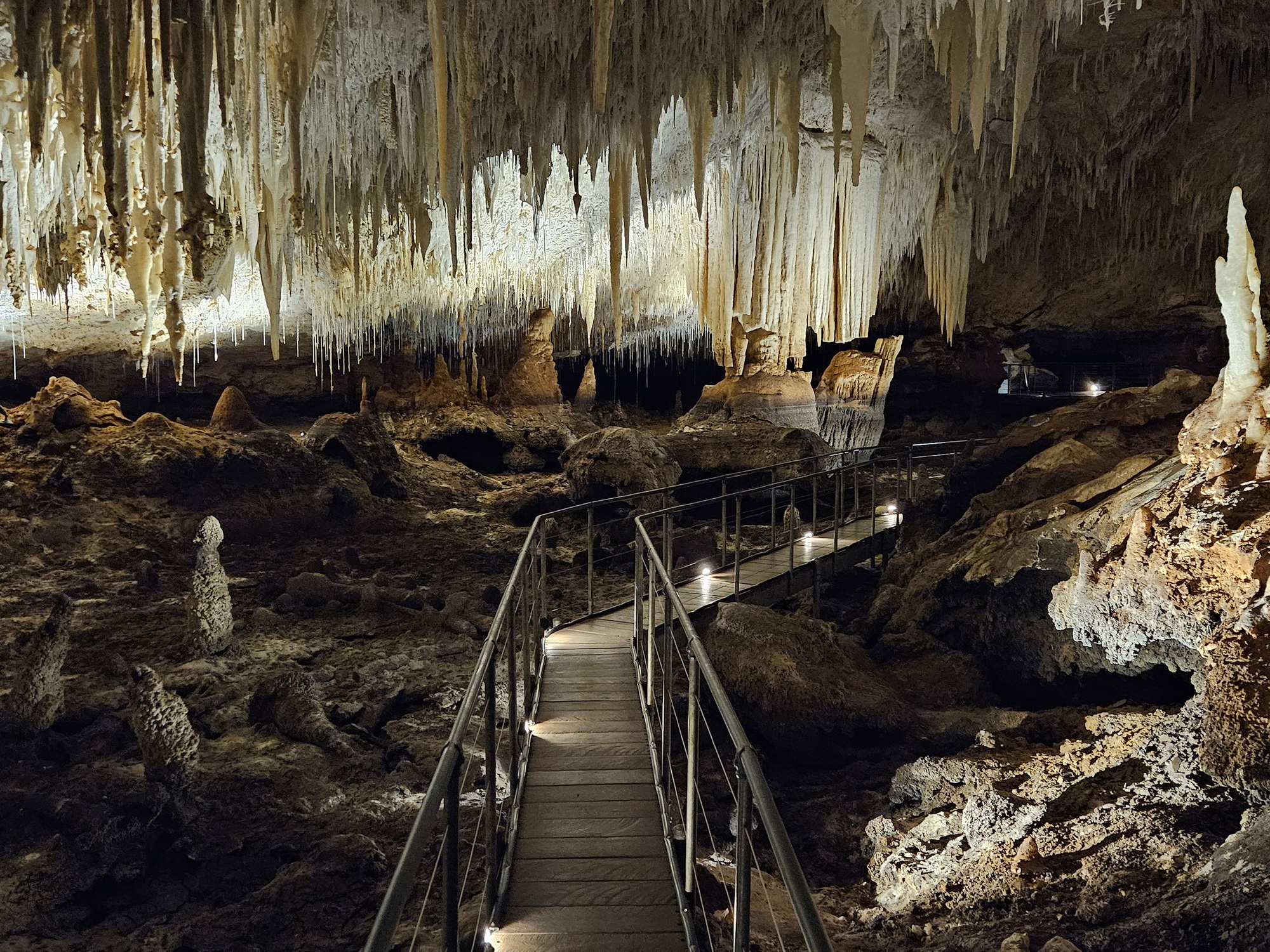 Die Jewel Cave ist die grösste für das Publikum zugängliche Kalkstein-Höhle in Westaustralien. 1957 wurde die Höhle per Zufall entdeckt. Cliff Spackman entdeckte ein Loch im Boden und liess sich durch einen 12m langen engen Kanal abseilen und dann hing er in der Luft, nämlich in der grossen Halle der Höhle. Die Entdeckung wurde geheimgehalten und gemeinsam mit der Regierung wurde die Höhle für das Publikum erschlossen. Ein neuer Eingang musste geschaffen werden, da es neben dem ursprünglichen Eingang keinen weiteren Zugang gibt. Besichtigt werden kann 20% der Höhle auf sehr gut ausgebauten Pfaden, Treppen und Plattformen zusammen mit einem Guide. Wir buchten gleich die erste Tour um 0930 und hatten Glück, dass wir nur 7 Besucher waren.