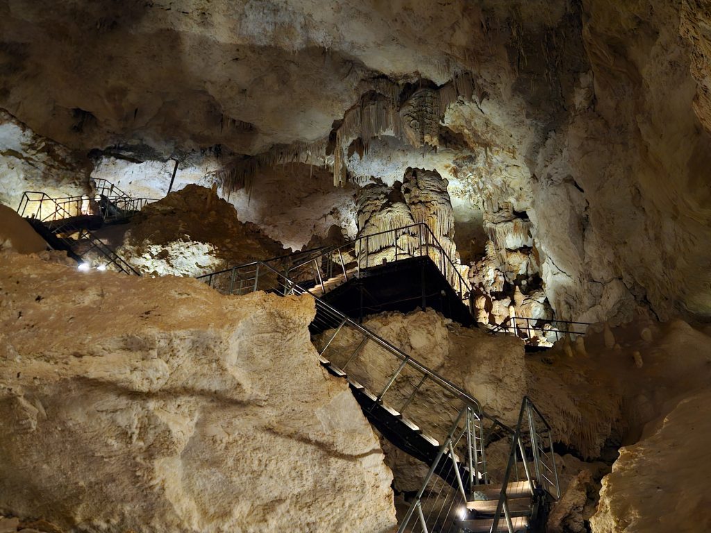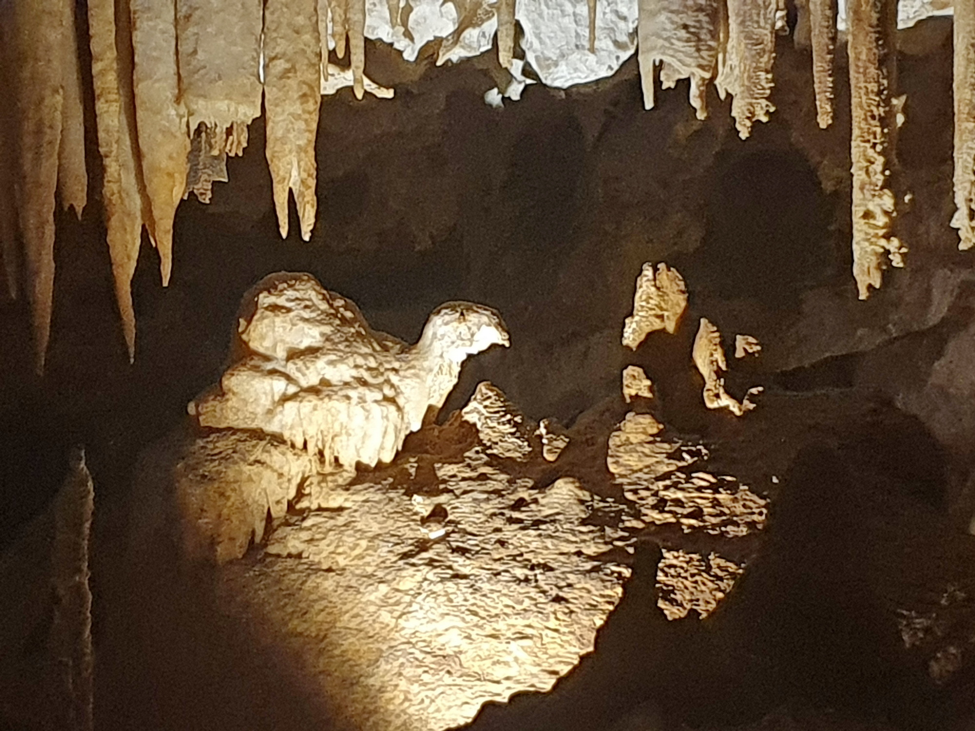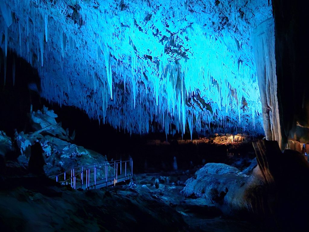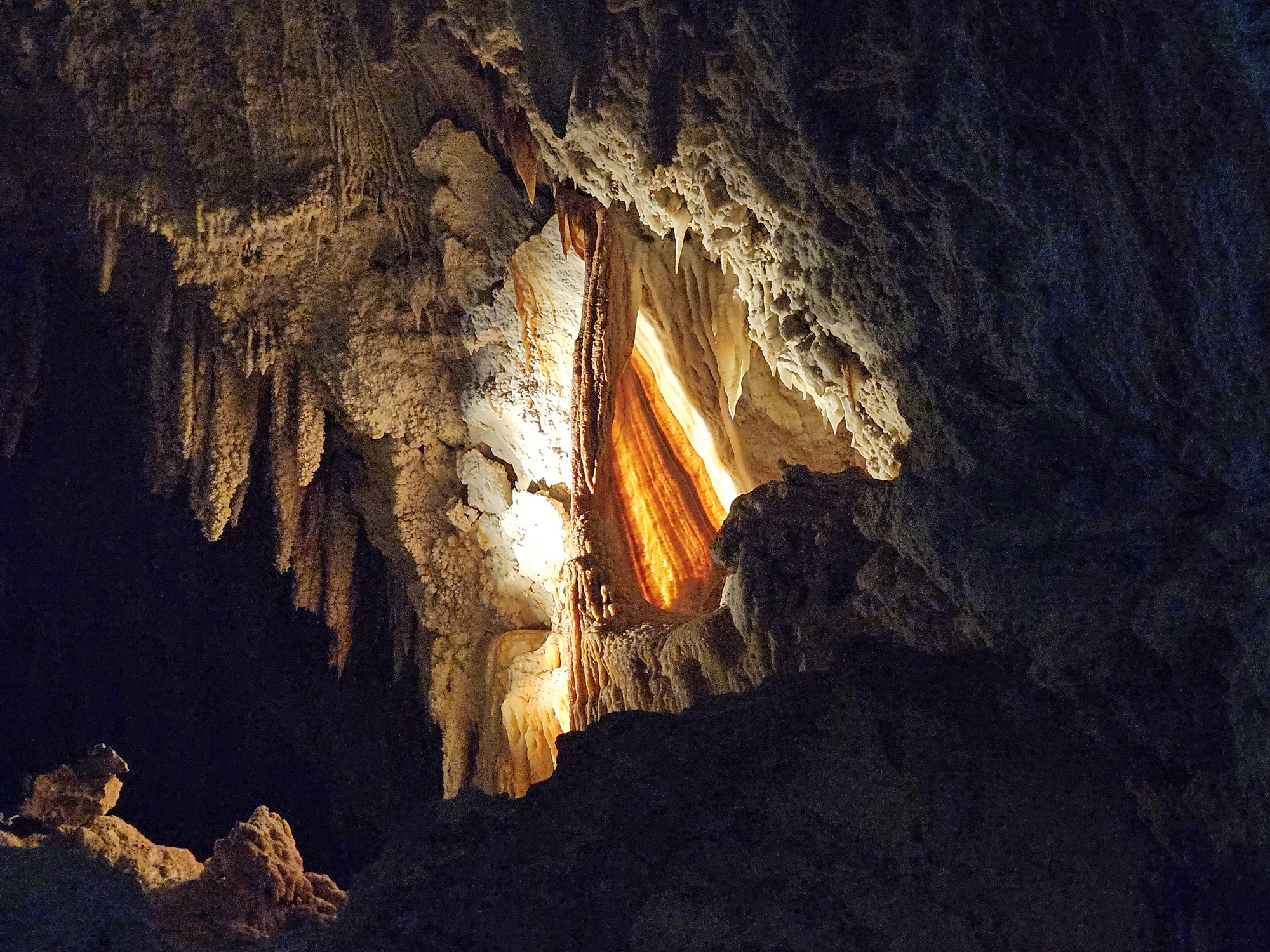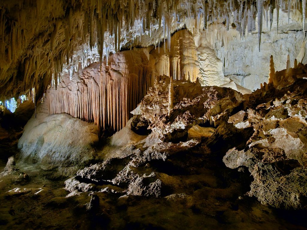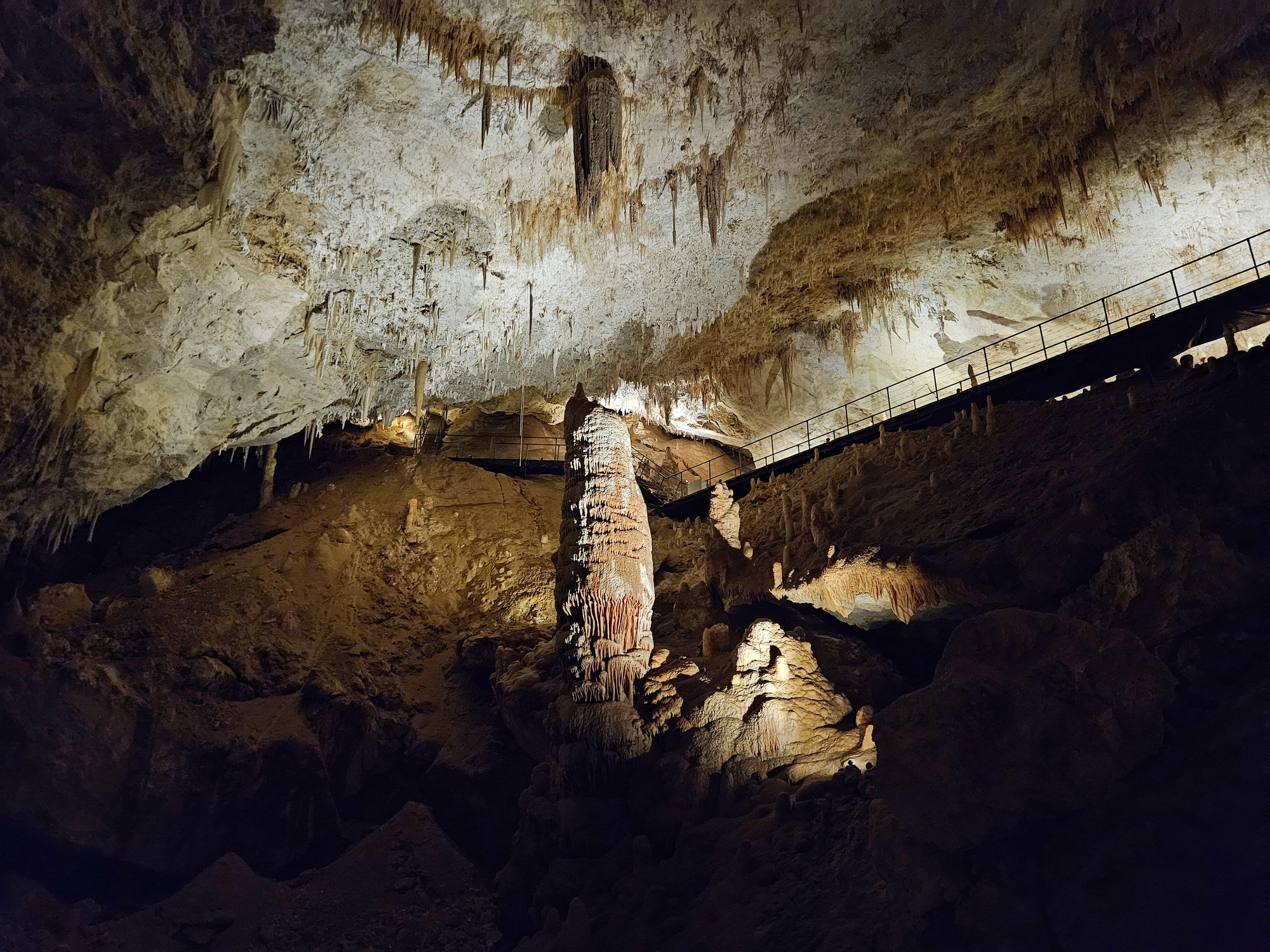 Die Jewel Cave ist die grösste für das Publikum zugängliche Kalkstein-Höhle in Westaustralien. 1957 wurde die Höhle per Zufall entdeckt. Cliff Spackman entdeckte ein Loch im Boden und liess sich durch einen 12m langen engen Kanal abseilen und dann hing er in der Luft, nämlich in der grossen Halle der Höhle. Die Entdeckung wurde geheimgehalten und gemeinsam mit der Regierung wurde die Höhle für das Publikum erschlossen. Ein neuer Eingang musste geschaffen werden, da es neben dem ursprünglichen Eingang keinen weiteren Zugang gibt. Besichtigt werden kann 20% der Höhle auf sehr gut ausgebauten Pfaden, Treppen und Plattformen zusammen mit einem Guide. Wir buchten gleich die erste Tour um 0930 und hatten Glück, dass wir nur 7 Besucher waren.
